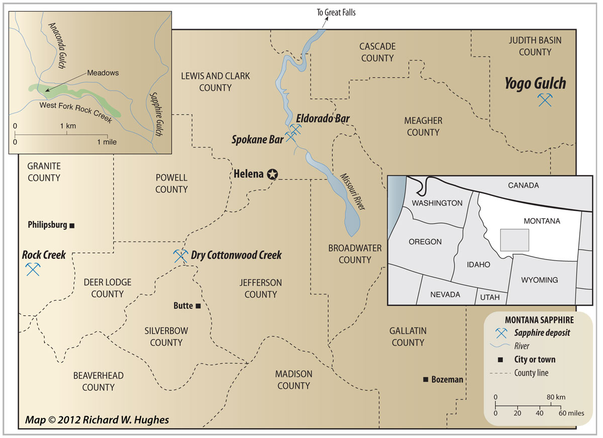 Map of central Montana showing the location of the Yogo mineMap of central Montana showing the location of the Marc's Dry Cottonwood Creek mine. Click on the map for a larger image. Map © Richard W. Hughes