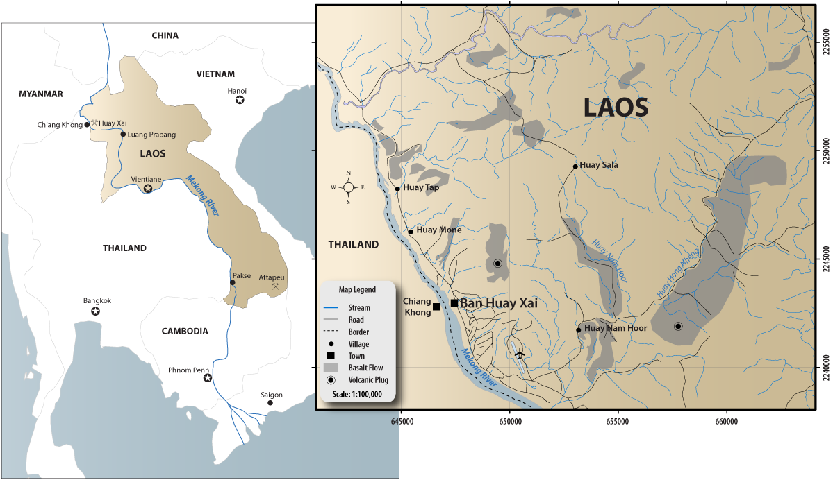 Figure 1. Map of Laos showing the location of the sapphire mines. Click on the map for a larger image. Maps: Richard W. Hughes & Donekeo Intavong