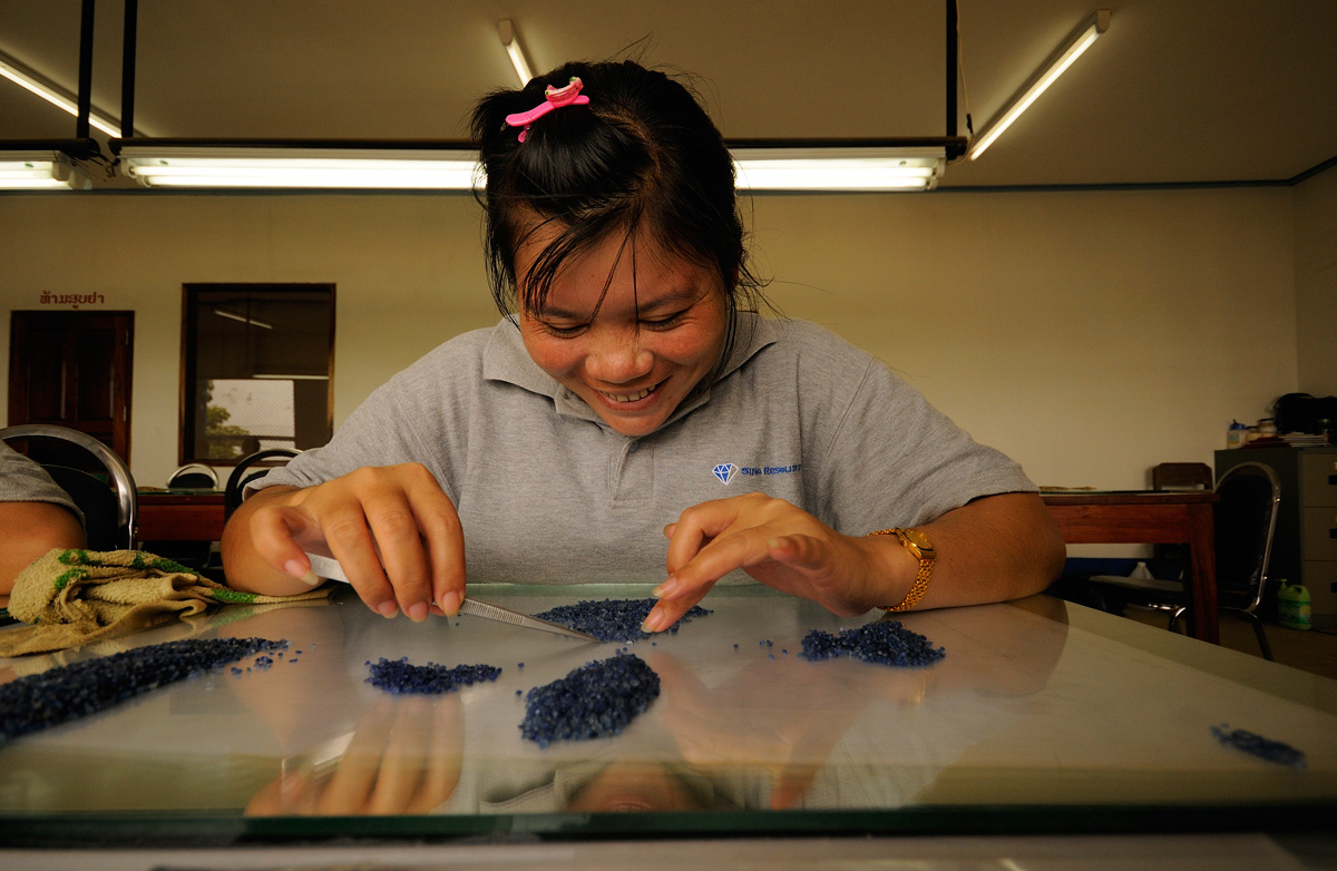 Figure 8: Sorting rough sapphire at SinoRMC’s Huay Xai operation. SinoRMC is one of the largest private employers in Laos’ Bokèo District. Click on the photo for a larger image. Photo: Ryan Libre