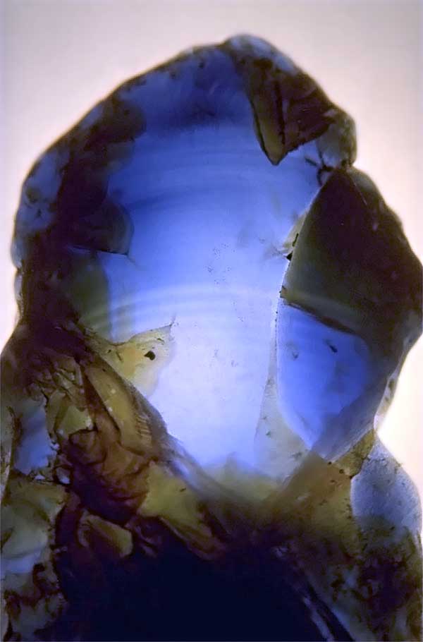 One need look no further for proof of Dick's Law than the images below. Southeast Asian con artists know that, unlike many natural blue sapphires, no Verneuil synthetic product exists where both blue and yellow are found in the same stone. They also know that, if you are an experienced dealer worth your sapphire, you know that, too. Thus in order to give us interesting stories to tell our children, those clever people take fragments of Verneuil synthetic rough and, after a good tumbling to give the appearance of alluvial wear, apply yellow stains to the outside and into fractures. When you hold that sucker up to the light to check color distribution, you're rewarded with the sight of yellow and blue banding in the same crystal—obviously natural.